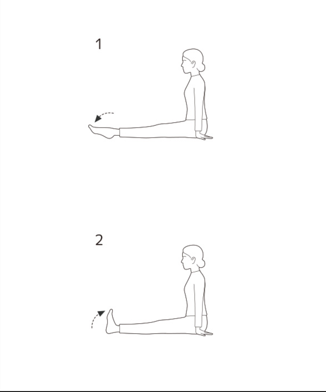 ②つま先をゆっくりと遠くに伸ばして、すねを伸ばします