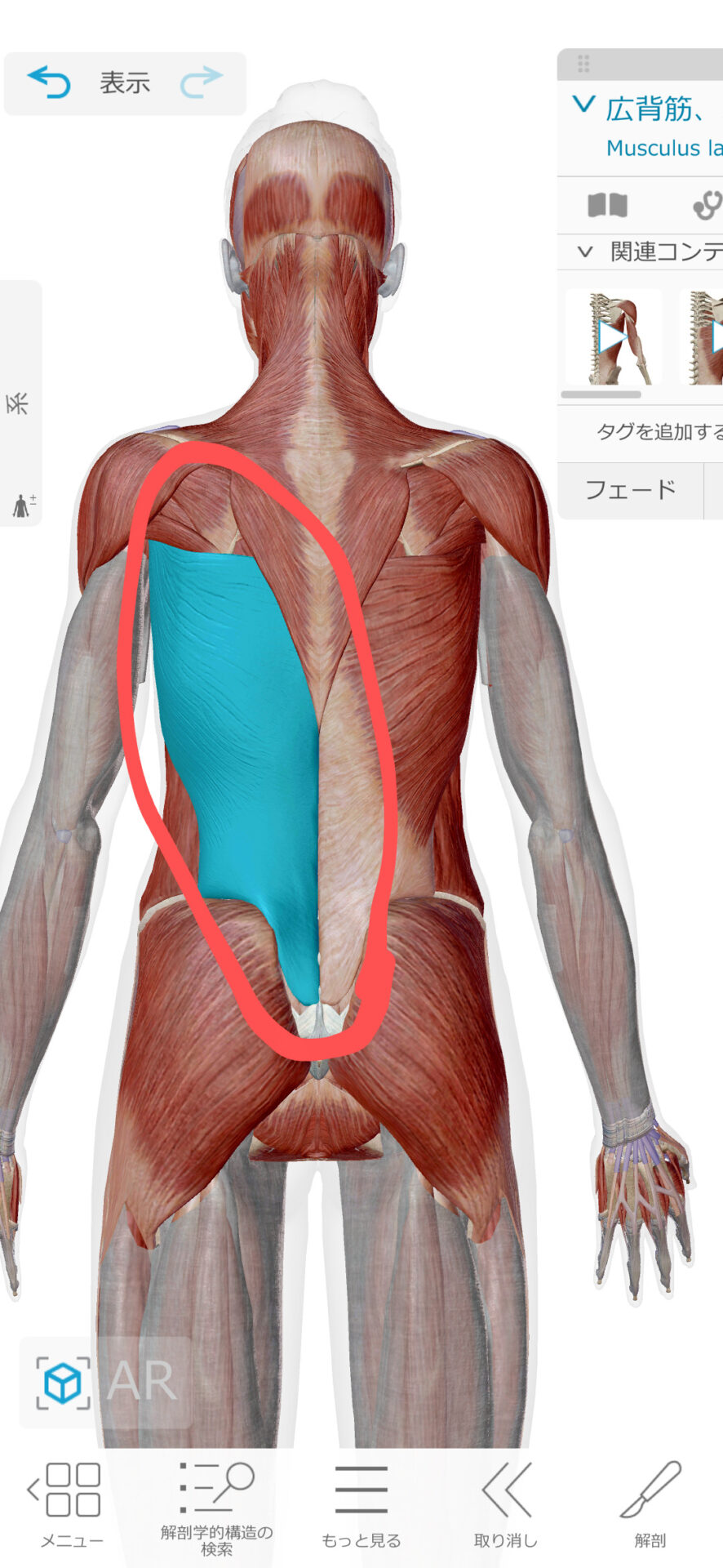 まず、広背筋は胸腰筋膜を通して腰椎棘突起と仙骨棘突起(T6~S5レベル)と棘上靱帯に付いています。