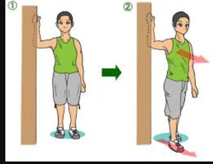 2: 腕を壁につけたまま、胸を前に突き出すようにして伸ばしていきます。
