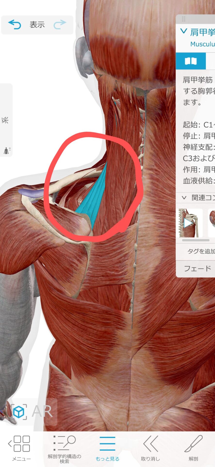 この筋肉は第1頸椎~第4頸椎の横突起から始まり、肩甲骨に繋がっている筋肉です。