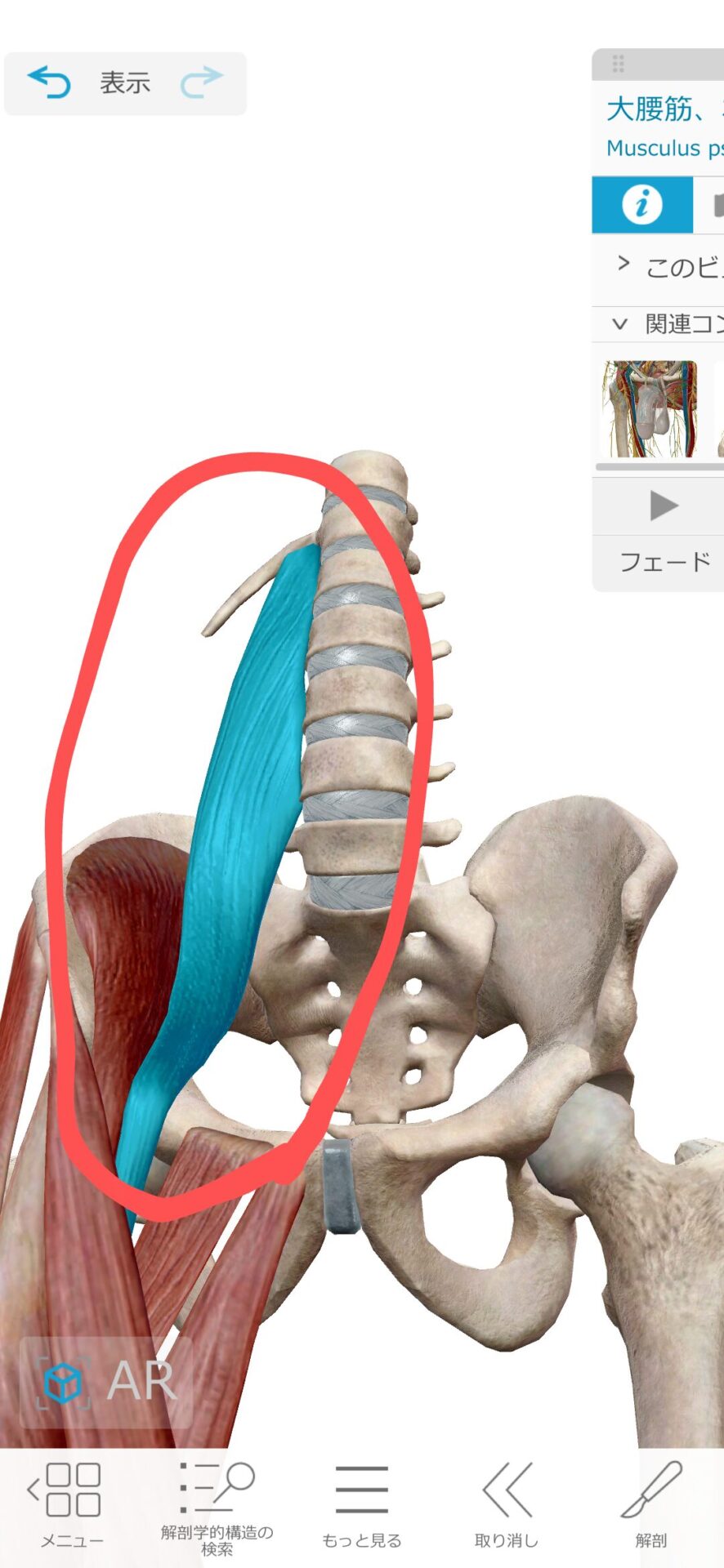 この筋肉は、第12胸椎~腰椎の横突起から大腿骨の小転子に繋がっている筋肉です。