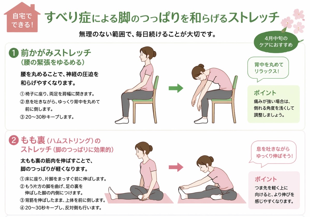脚のつっぱりを軽く考えず、早めのケアが悪化予防のカギになります。