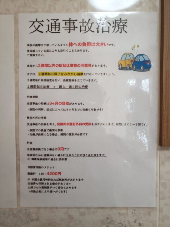 交通事故は自賠責保険が適用され、窓口での自己負担金がかからず治療を受けることが出来ます。日数が経過し処置が遅れると症状が悪化する恐れがあるためなるべく早めに治療することをオススメします。