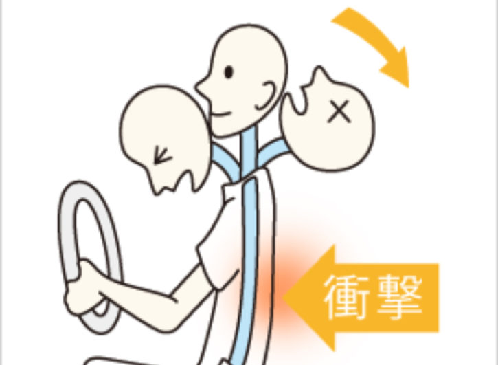 むち打ちになってしまい痛みで首を動かすことが辛くなります。頚椎(首の骨)の周りの筋肉や靭帯を損傷することが多く、頭痛を併発することまあります。