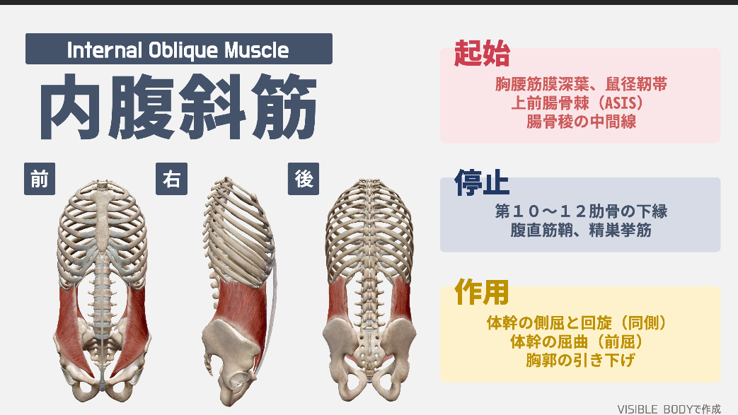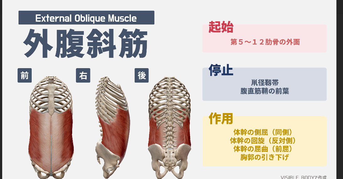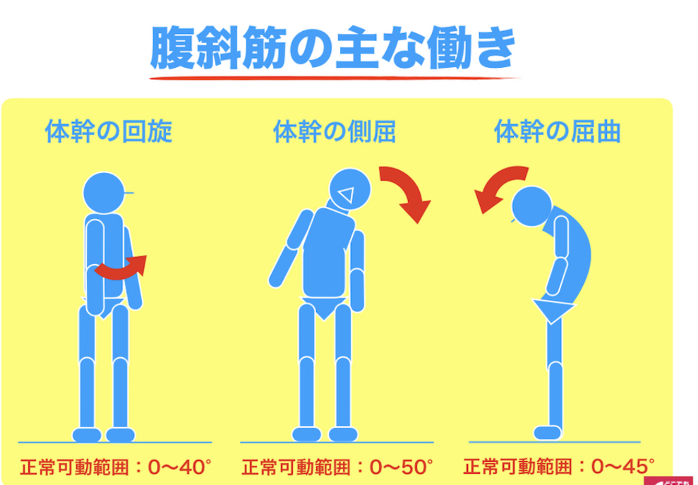 腹斜筋は体幹を前屈、回旋、側屈させる時に働きます。