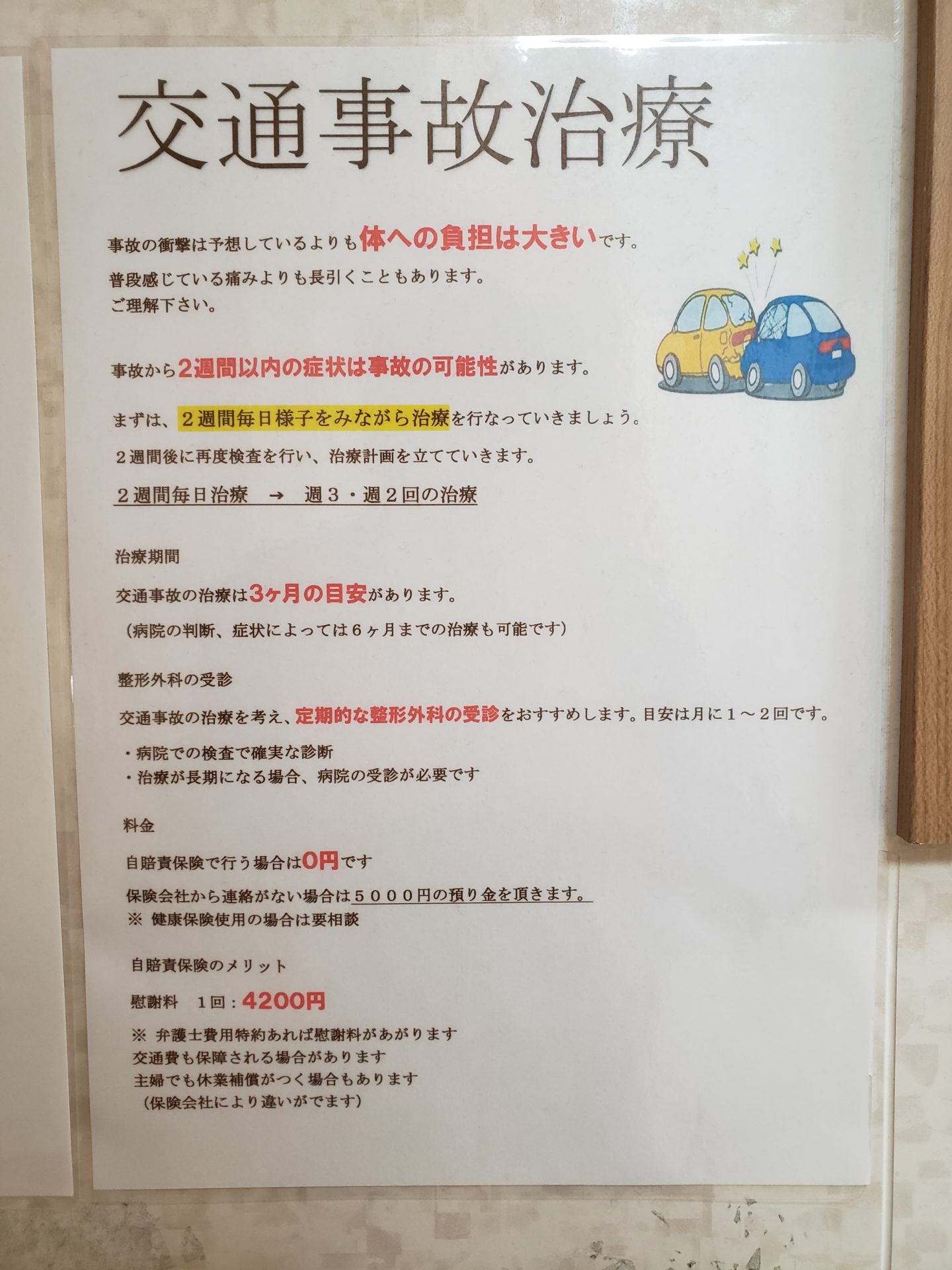 接骨院では交通事故事故の治療は自己負担金がかからず受診できますので、ご本人または回りの大切な方が交通事故にあってしまったら安心してふくしま接骨院までお越しください。
