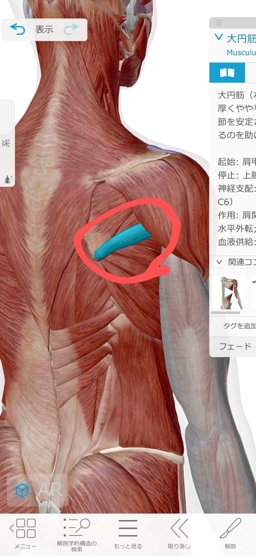 この筋肉は肩関節の内転、内旋、そして肩関節の伸展の作用があります。