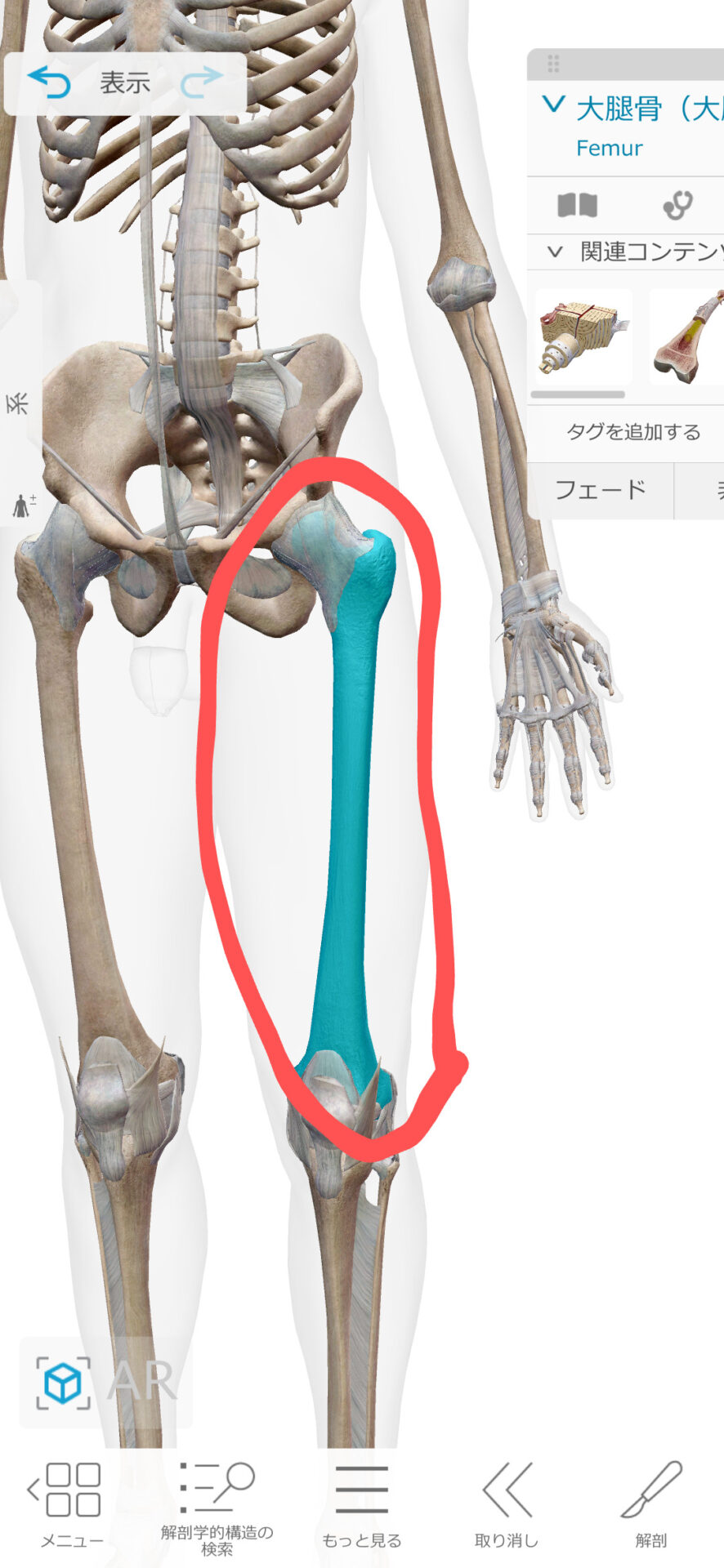 大腿骨は上腕骨と形が似ていて、関節側や肩関節側が丸くなっていて膝側の骨が横に広がっているのが特徴である。