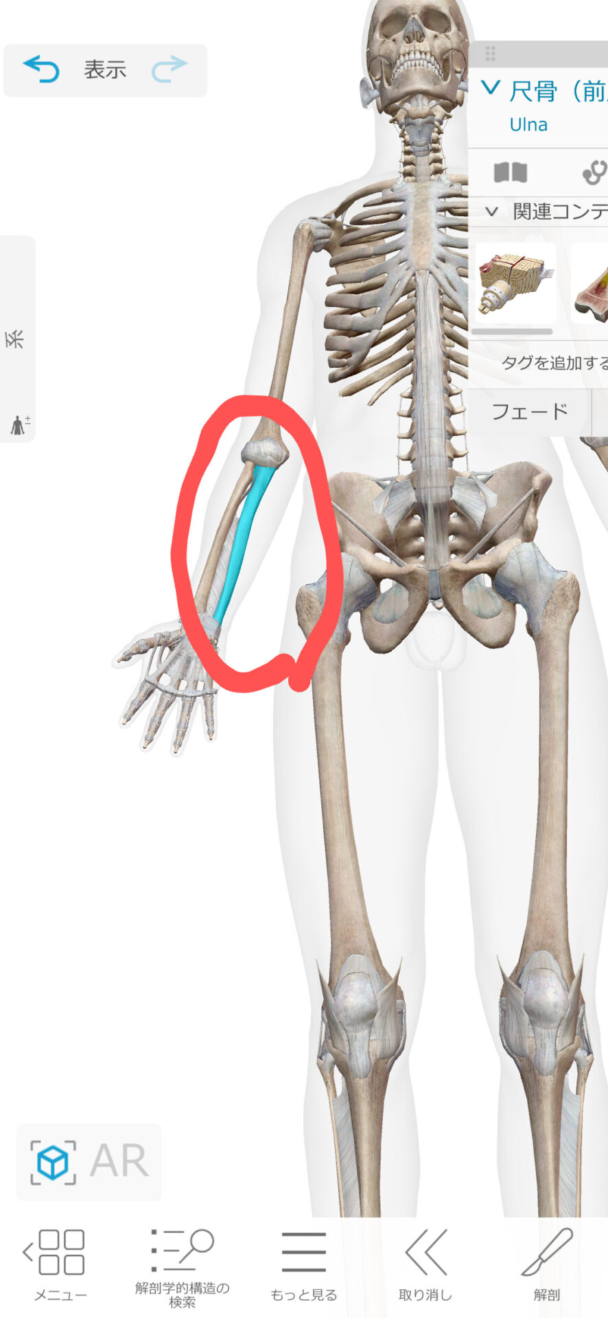 尺骨はイメージとしては六角レンチに形が似ているのが特徴で、肘から手首にかけて伸びている骨で他に橈骨と言う骨がありその2本に別れていて小指側に付いている骨が「尺骨」と言います。