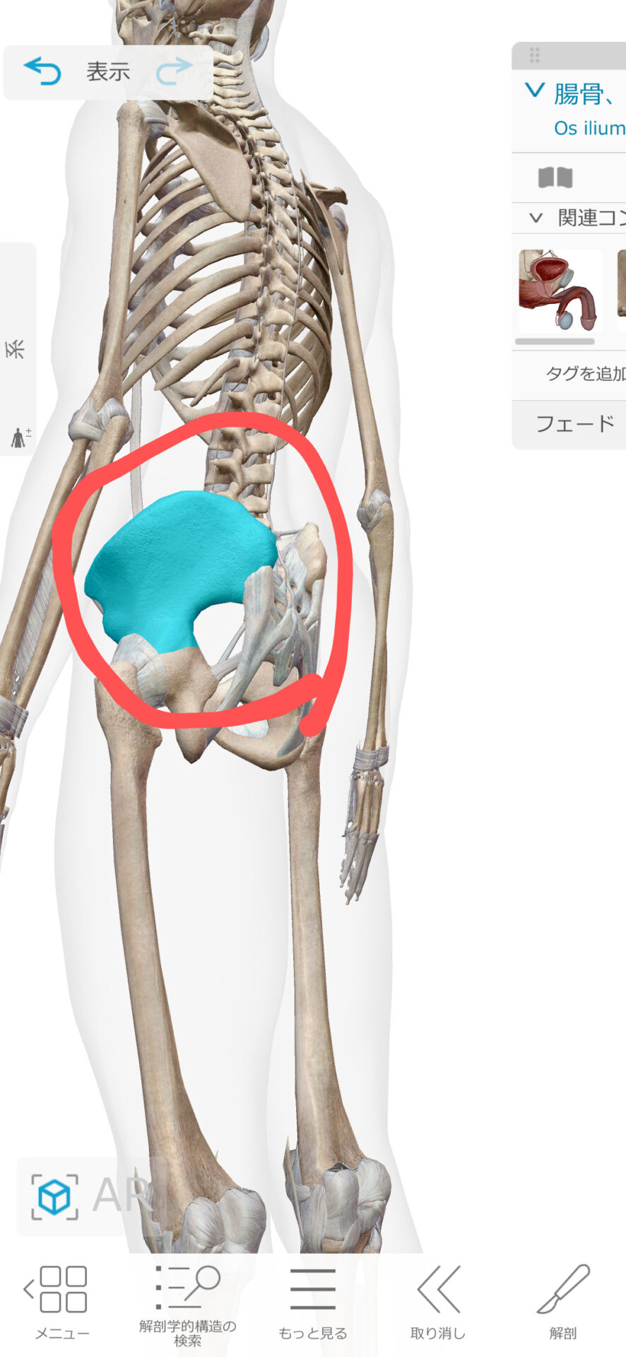 腸骨とは骨盤帯を作っている股関節の骨の1つで、寛骨臼から上に向いて伸びている上部を形成している。