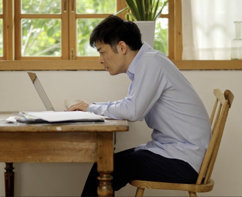パソコンの画面の位置を上に上げて、体幹が前傾しないようにすることが大切ですね。
