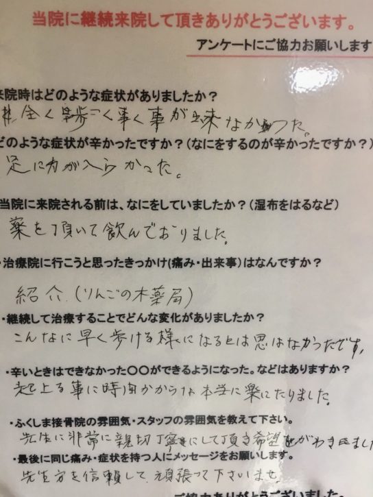 今日は、東京から福島市に転勤でいらしてて、腰や股関節の治療で通院してくれていたか患者様が今月いっぱいで東京に戻るとことになり挨拶にいらしてくれました。