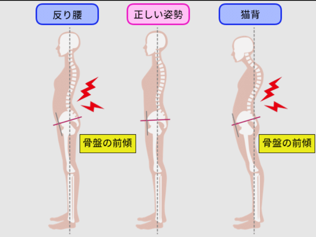 反り腰は、画像のように骨盤が前に倒れてしまって、その状態で真っ直ぐになろうとするので反り腰になってしまうのです!
