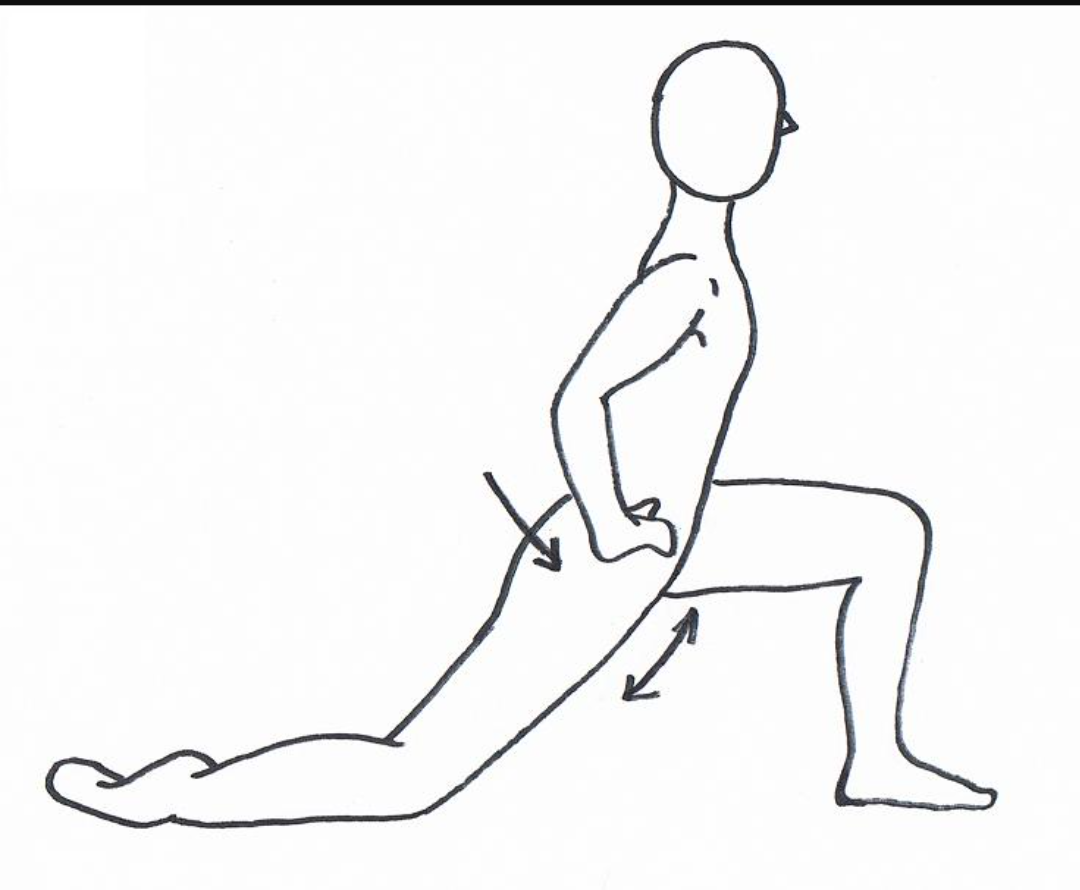 ②腰を前に付きだすと、後ろ足の太ももの前側が伸ばされ、
