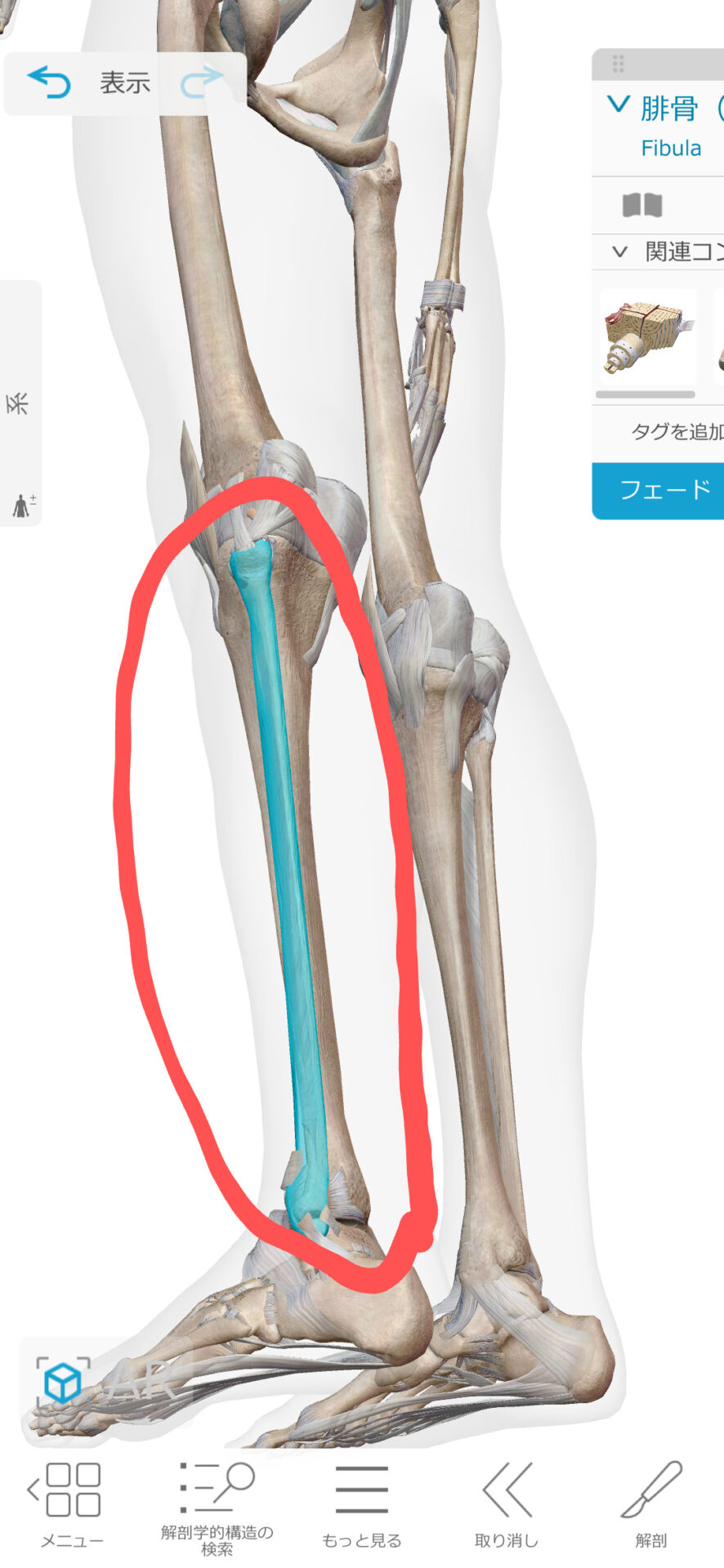 腓骨は小指側に付いているめん棒のような形をした細い骨のことで、ちなみに親指側に付いている太い骨のことを頸骨と言う。